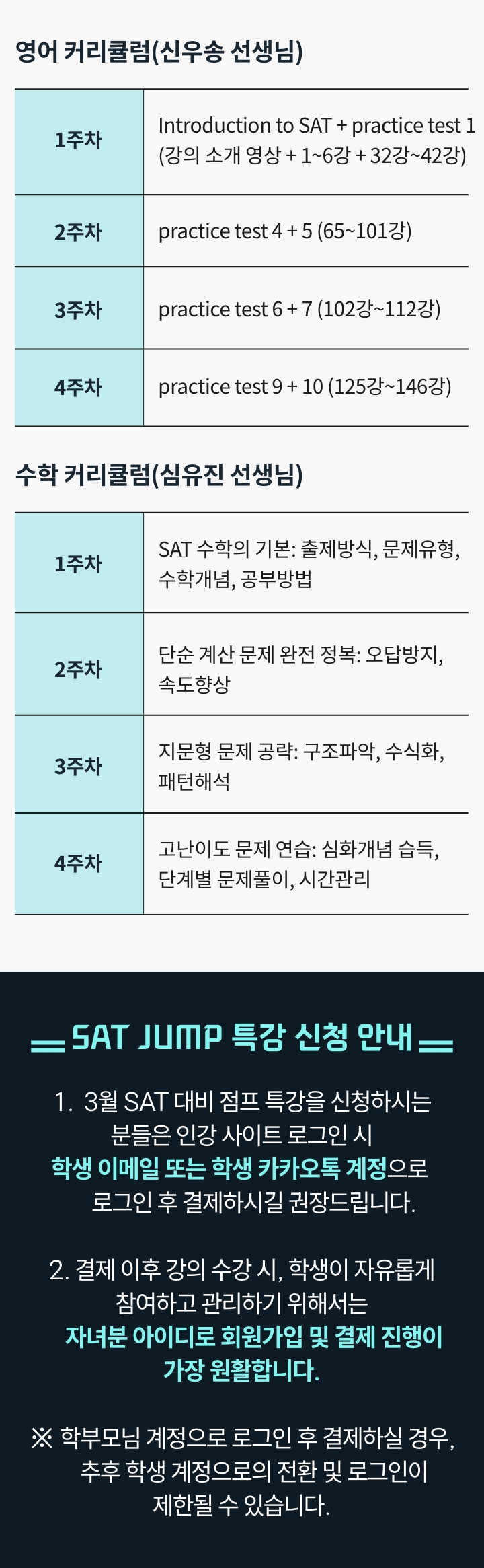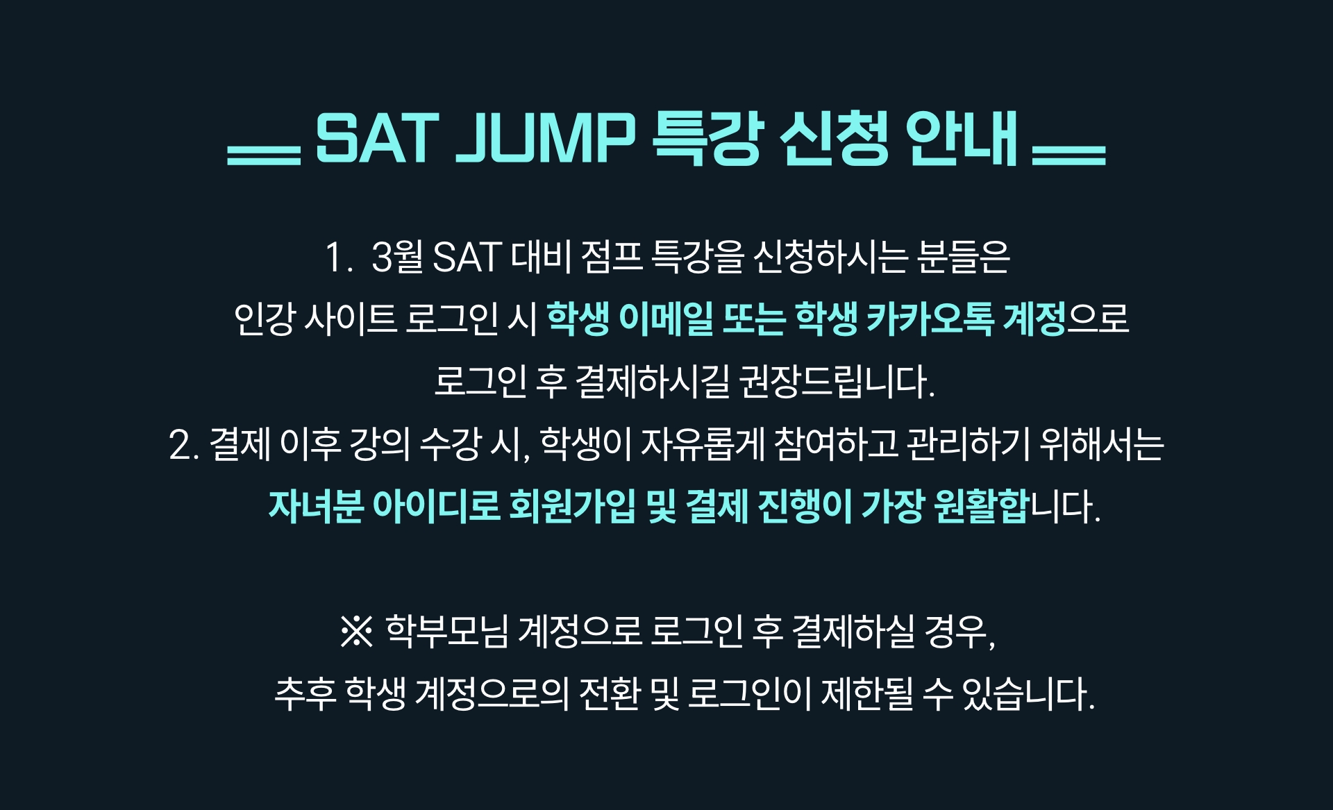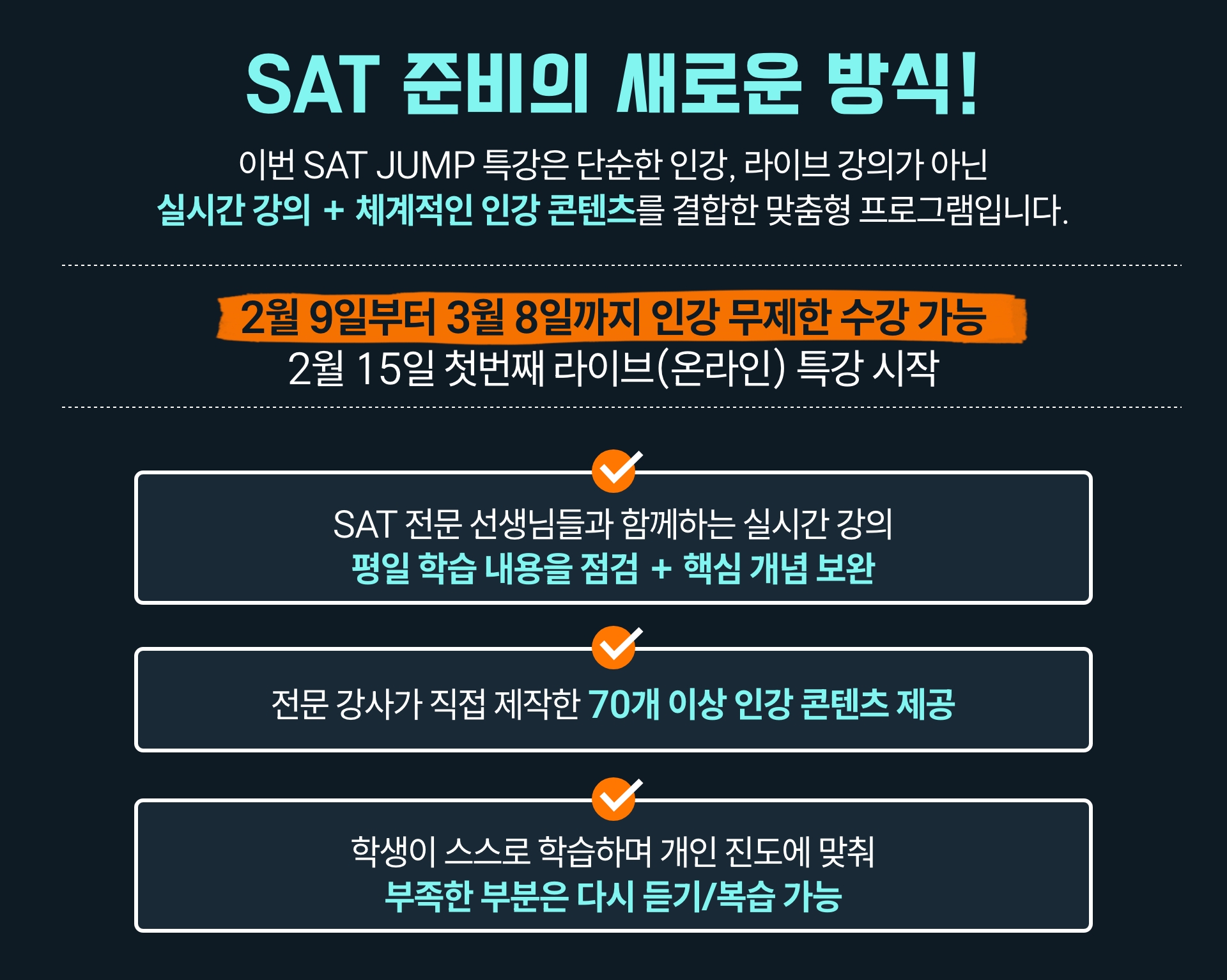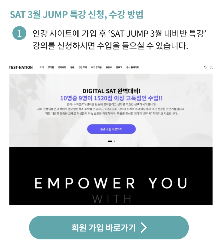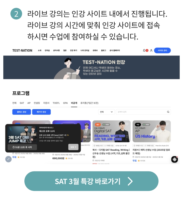 **SAT JUMP 특강은 라이브 강의와 인강 영상이 함께 제공되는 특별 과정으로, 수강 후에는 환불이 어려운 점 양해 부탁드립니다.**