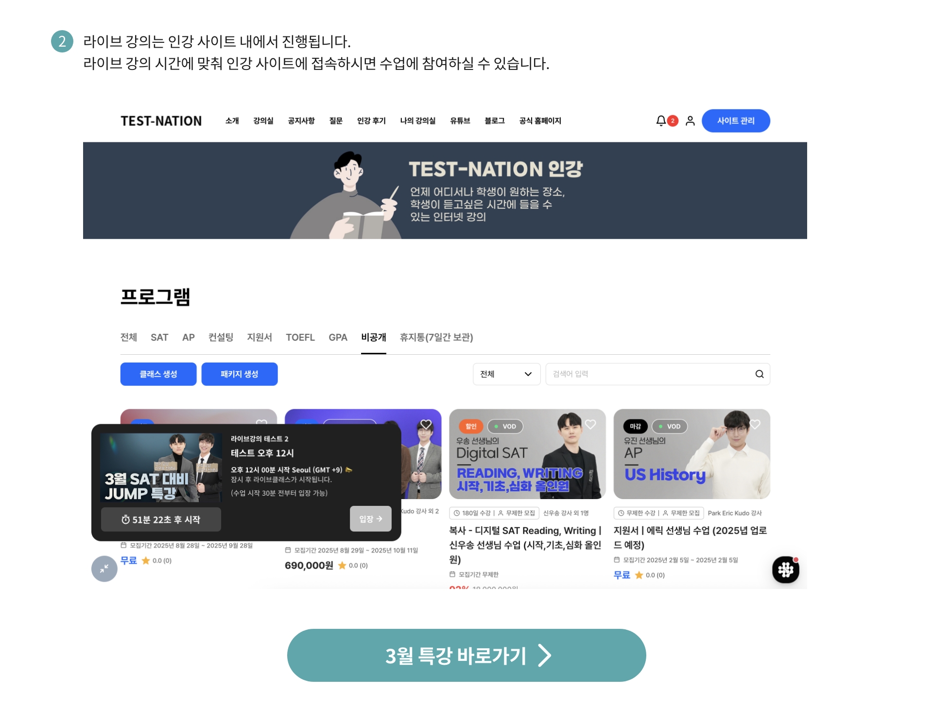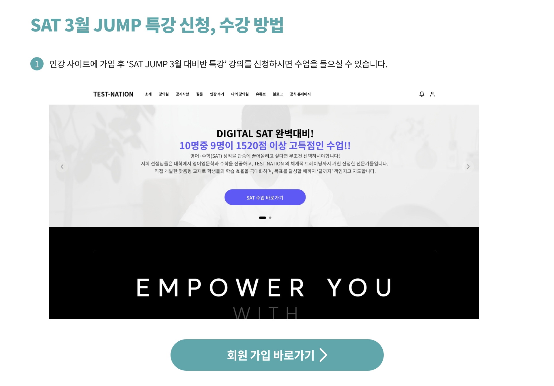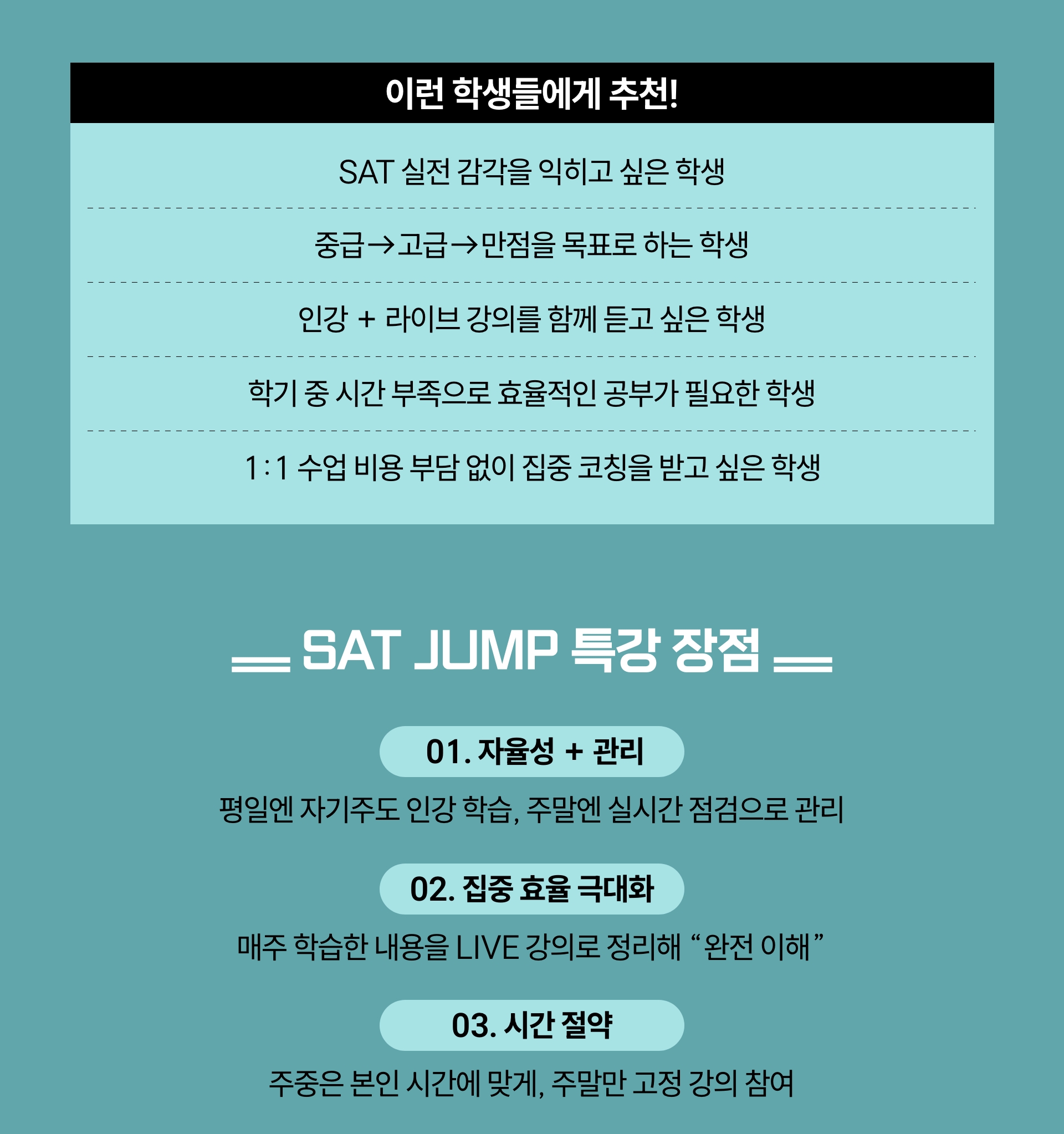 **SAT JUMP 특강은 라이브 강의와 인강 영상이 함께 제공되는 특별 과정으로, 수강 후에는 환불이 어려운 점 양해 부탁드립니다.**