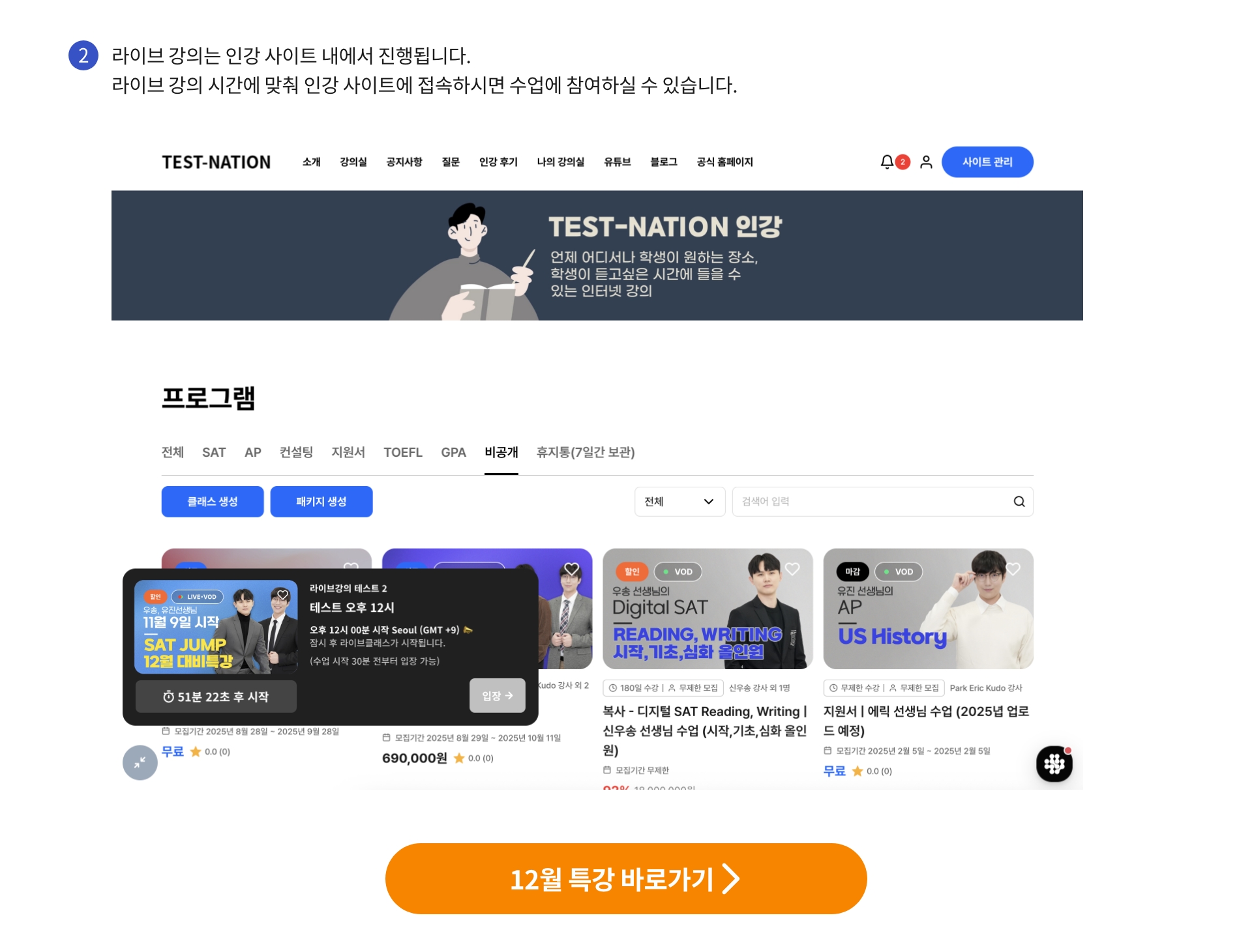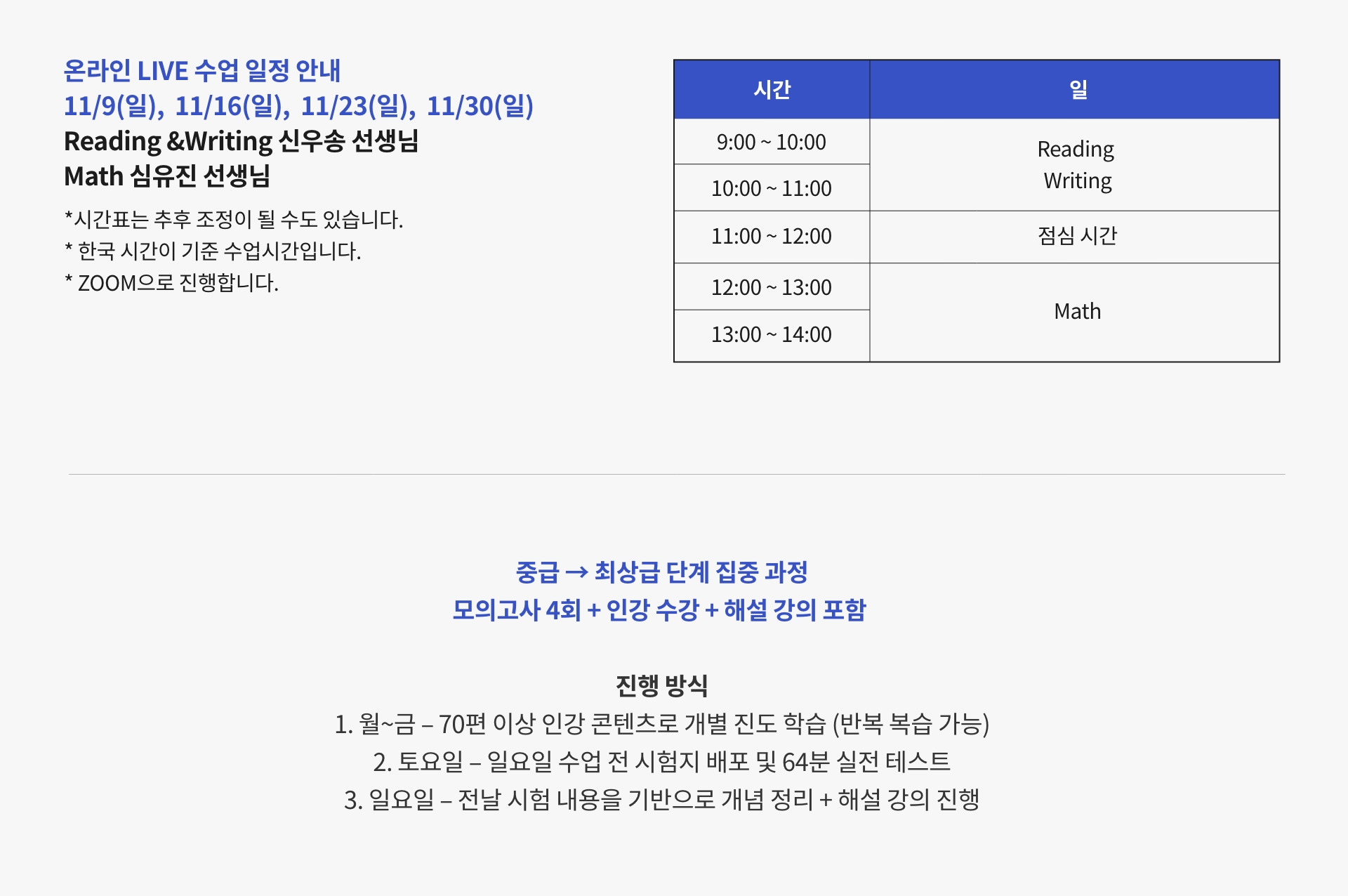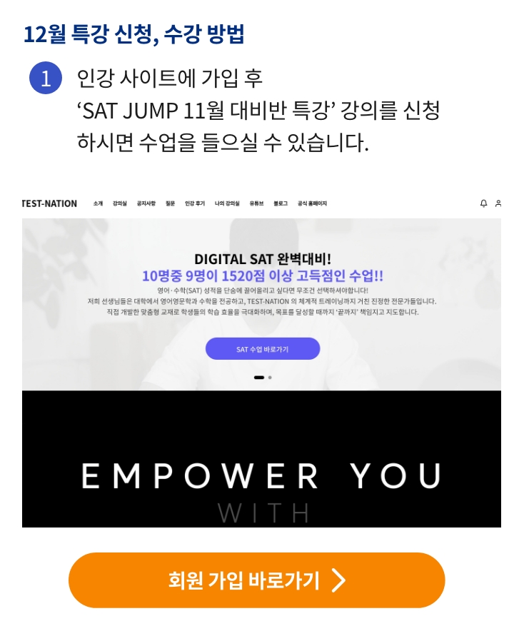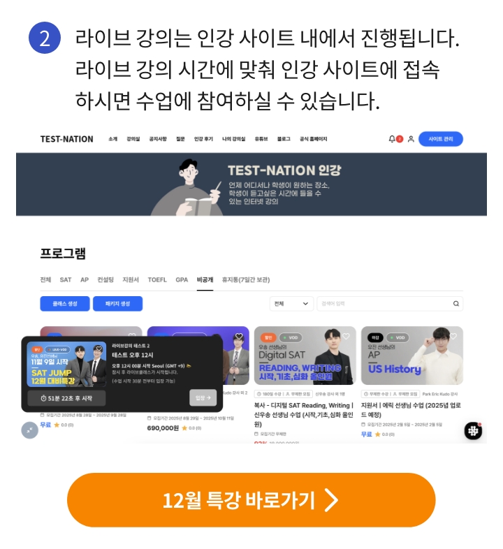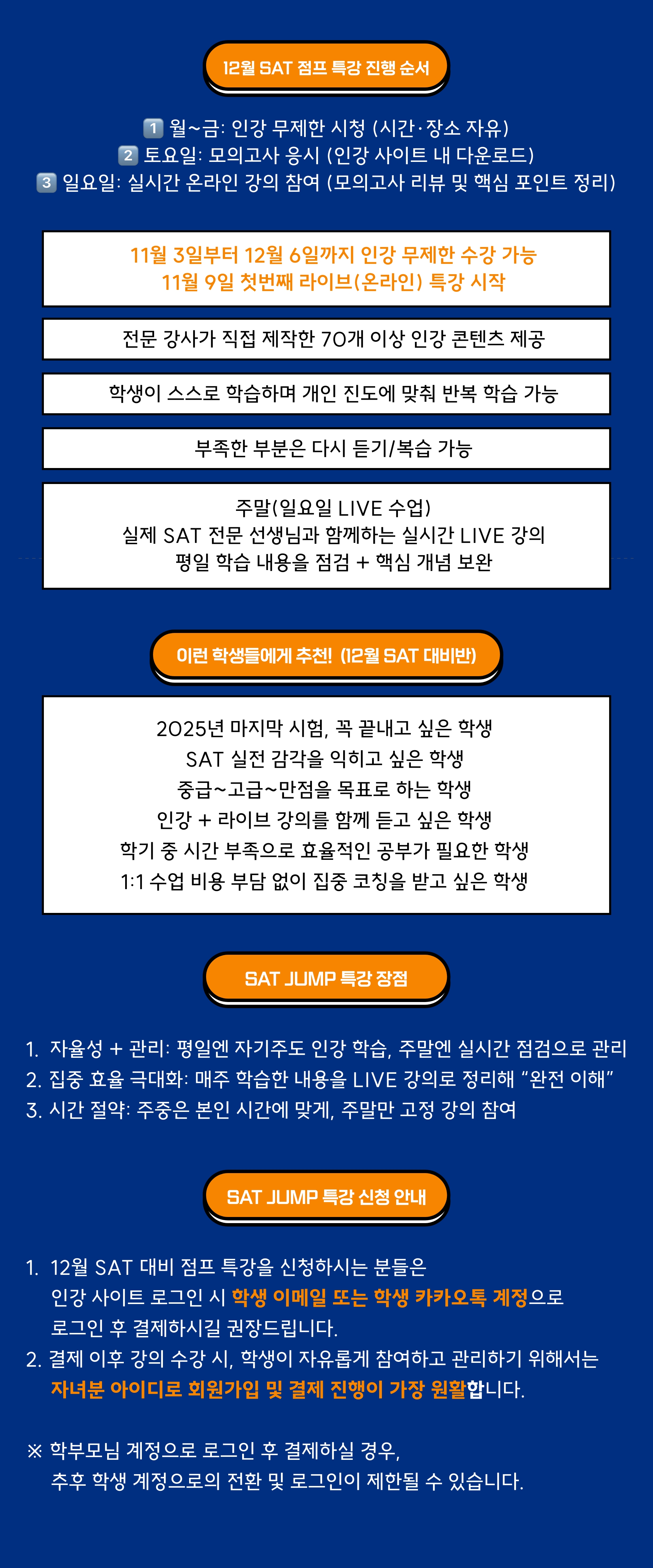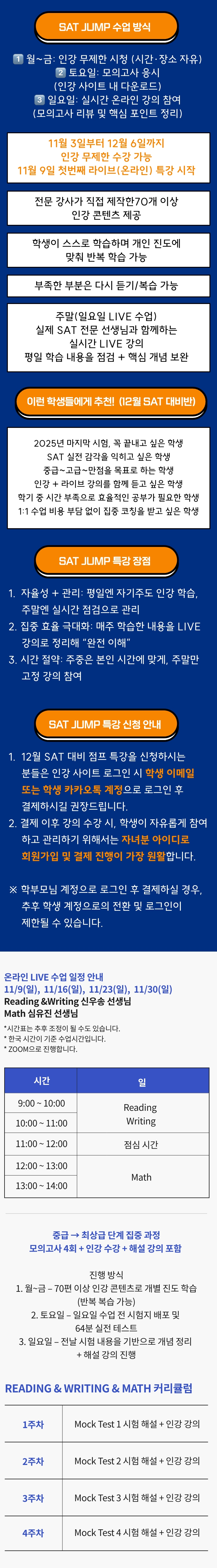 **SAT JUMP 특강은 라이브 강의와 인강 영상이 함께 제공되는 특별 과정으로, 수강 후에는 환불이 어려운 점 양해 부탁드립니다.**