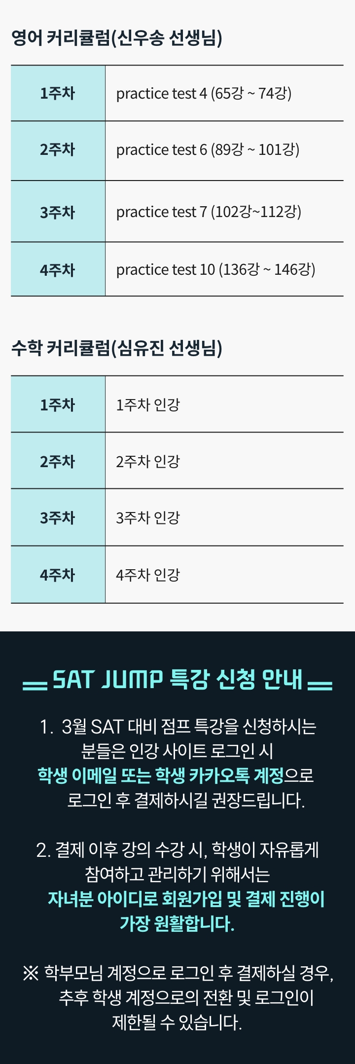 **SAT JUMP 특강은 라이브 강의와 인강 영상이 함께 제공되는 특별 과정으로, 수강 후에는 환불이 어려운 점 양해 부탁드립니다.**