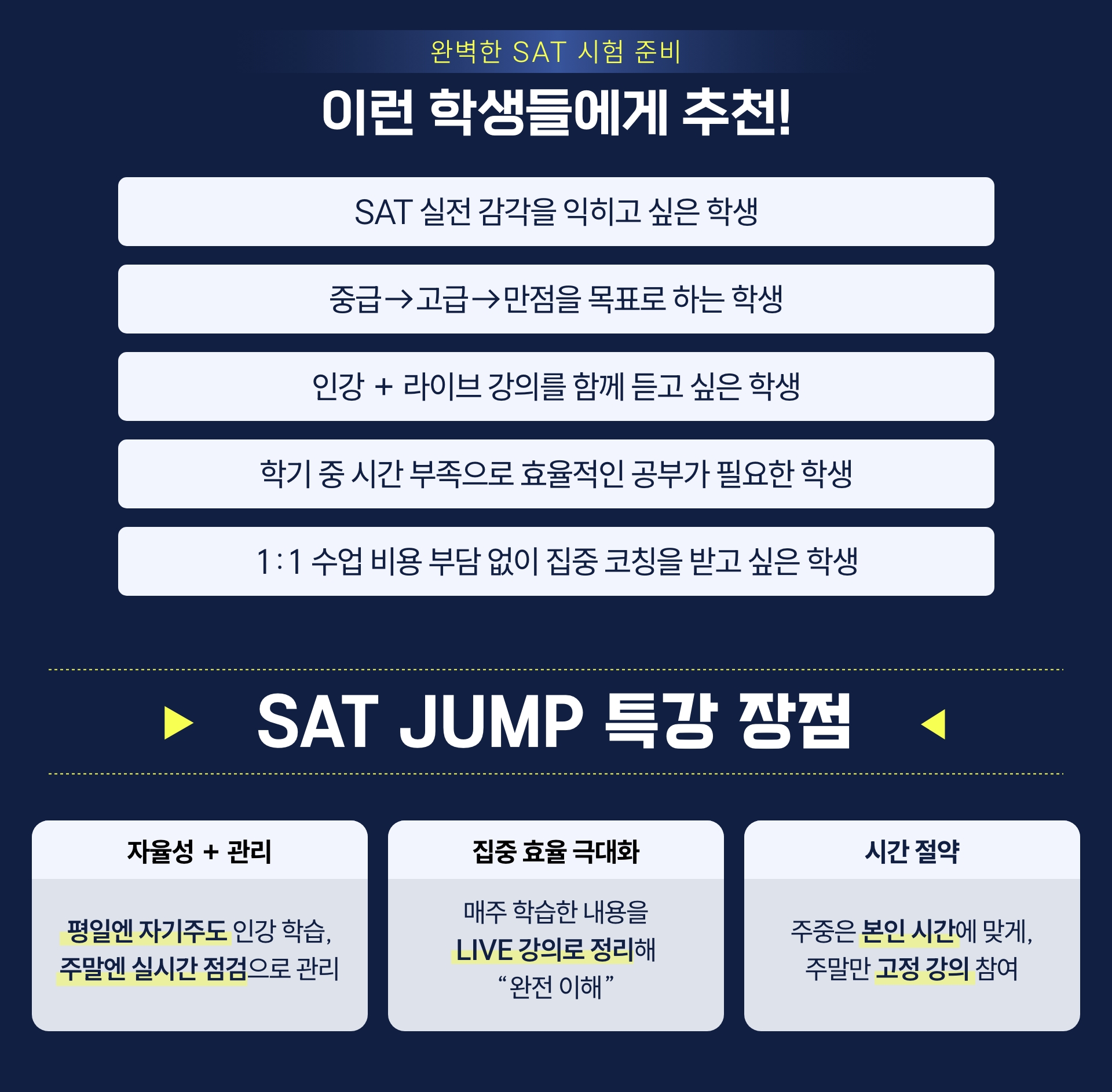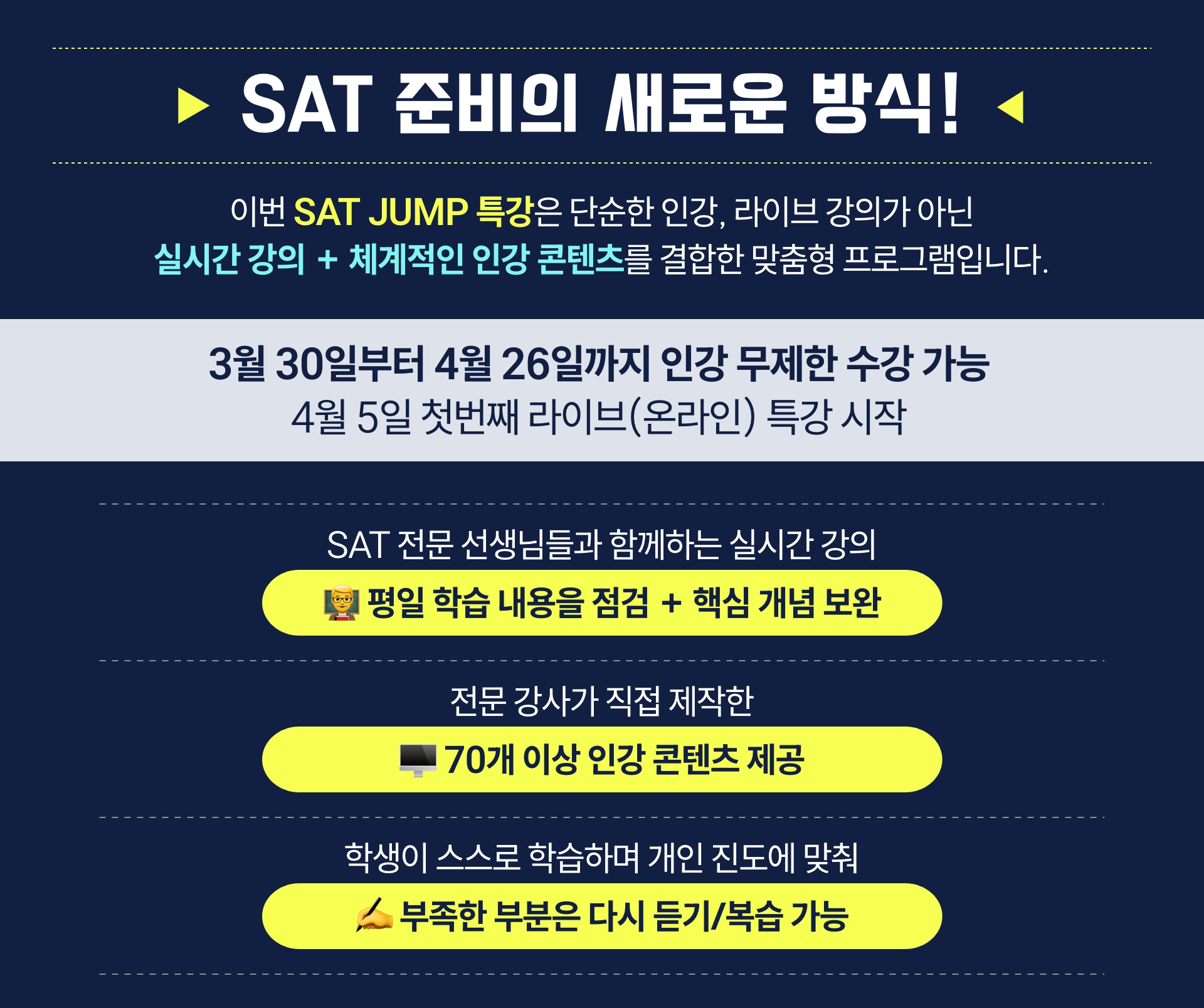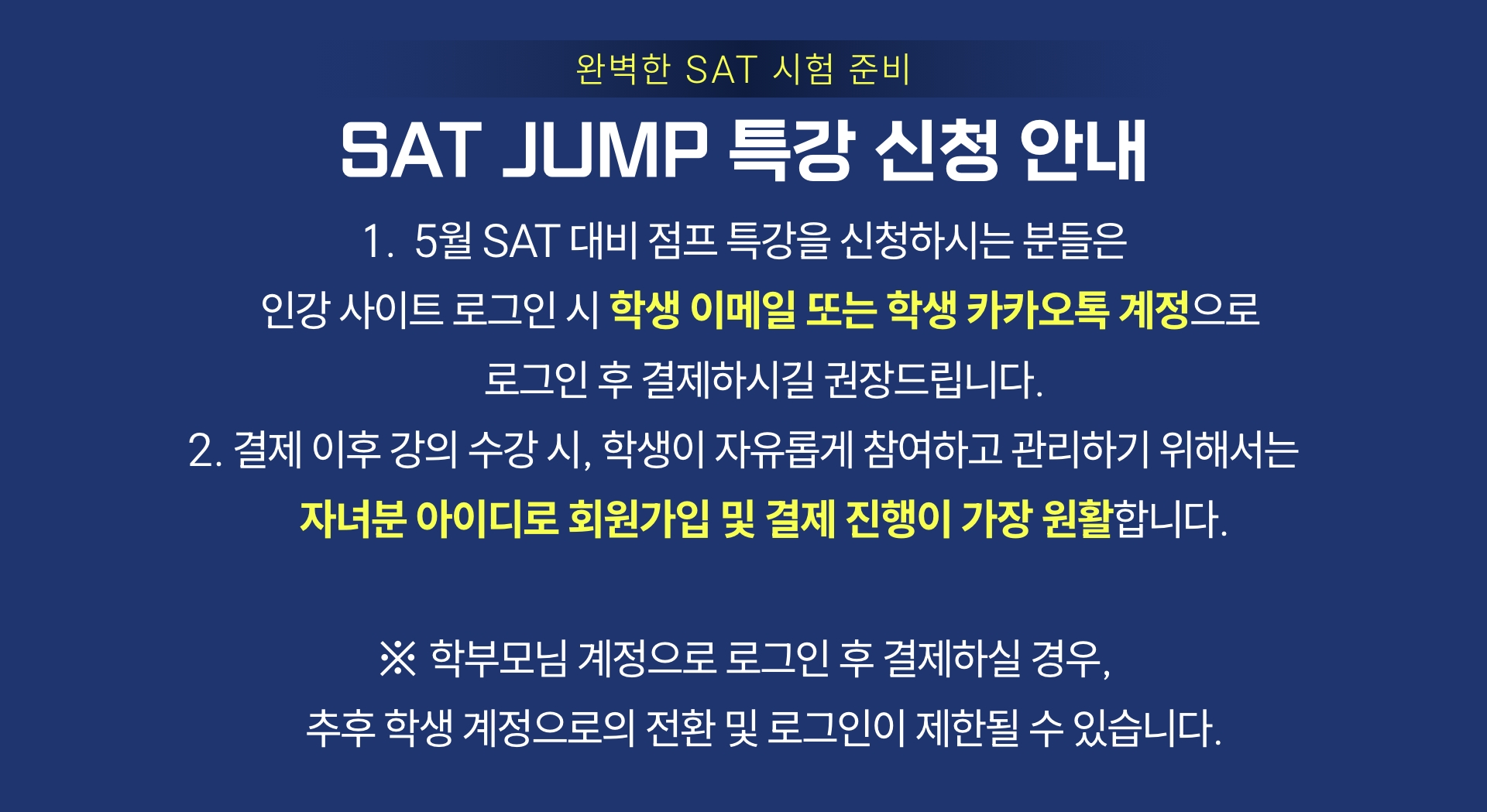 **SAT JUMP 특강은 라이브 강의와 인강 영상이 함께 제공되는 특별 과정으로, 수강 후에는 환불이 어려운 점 양해 부탁드립니다.**