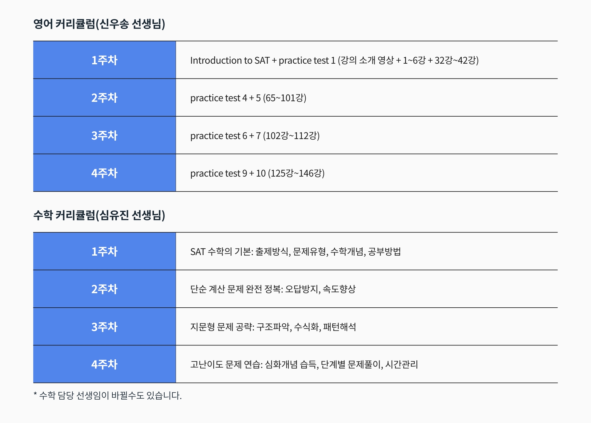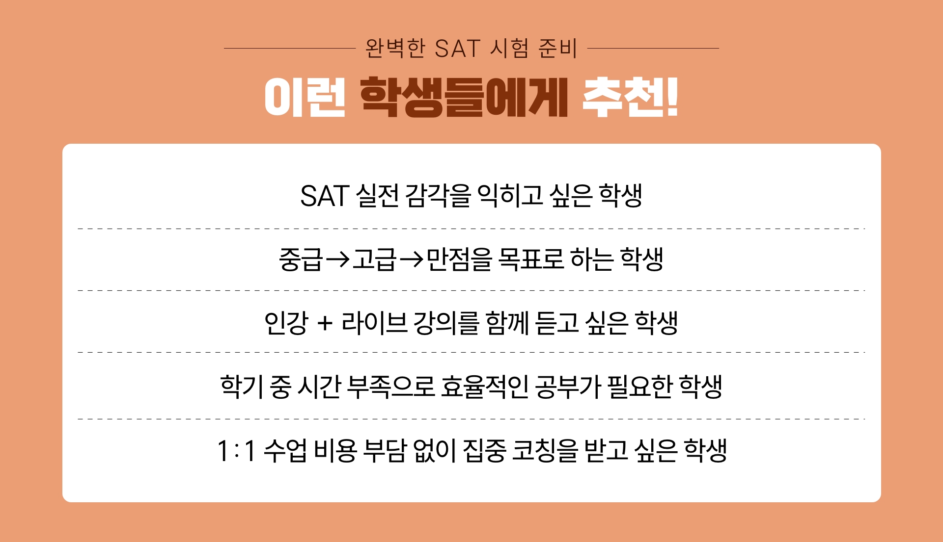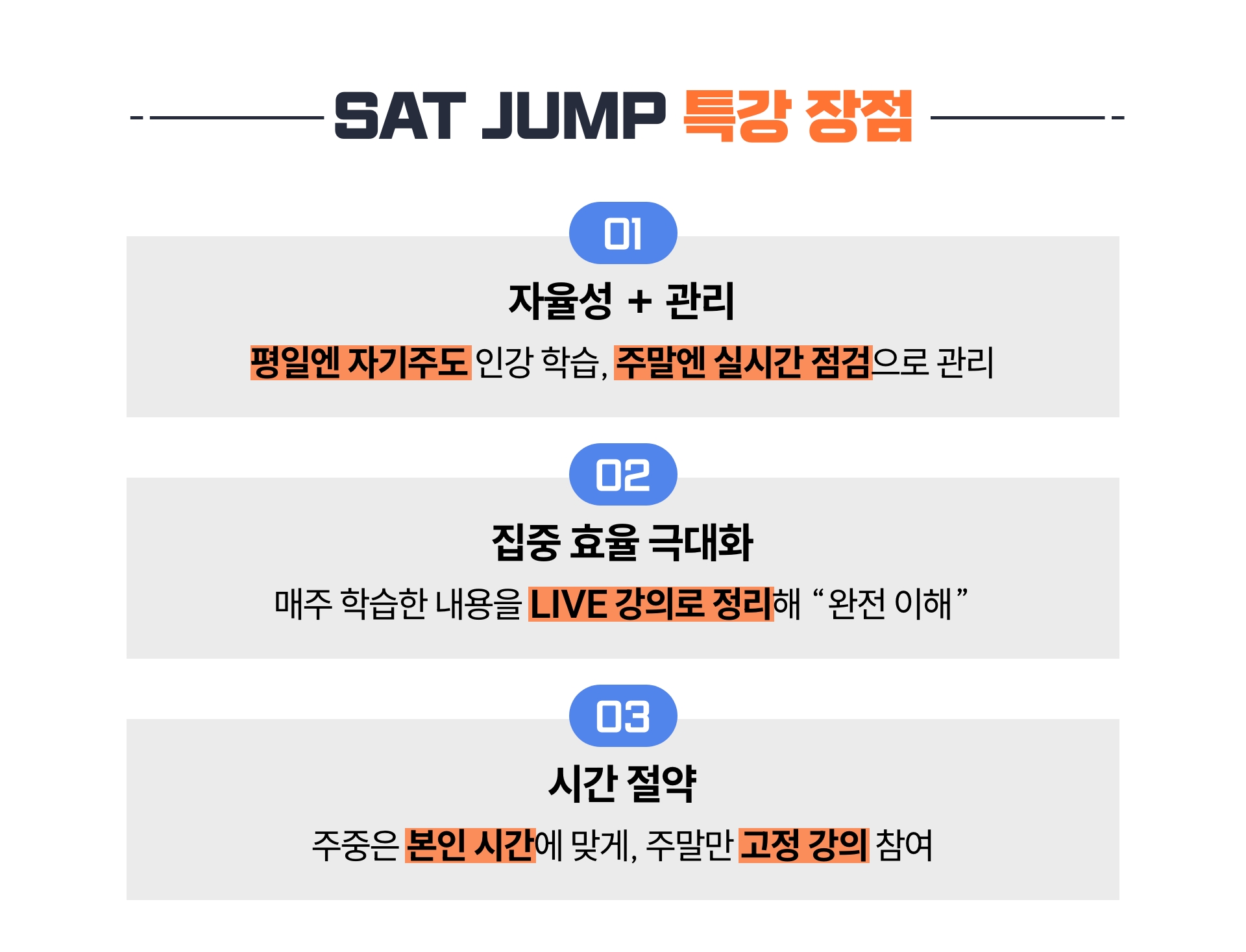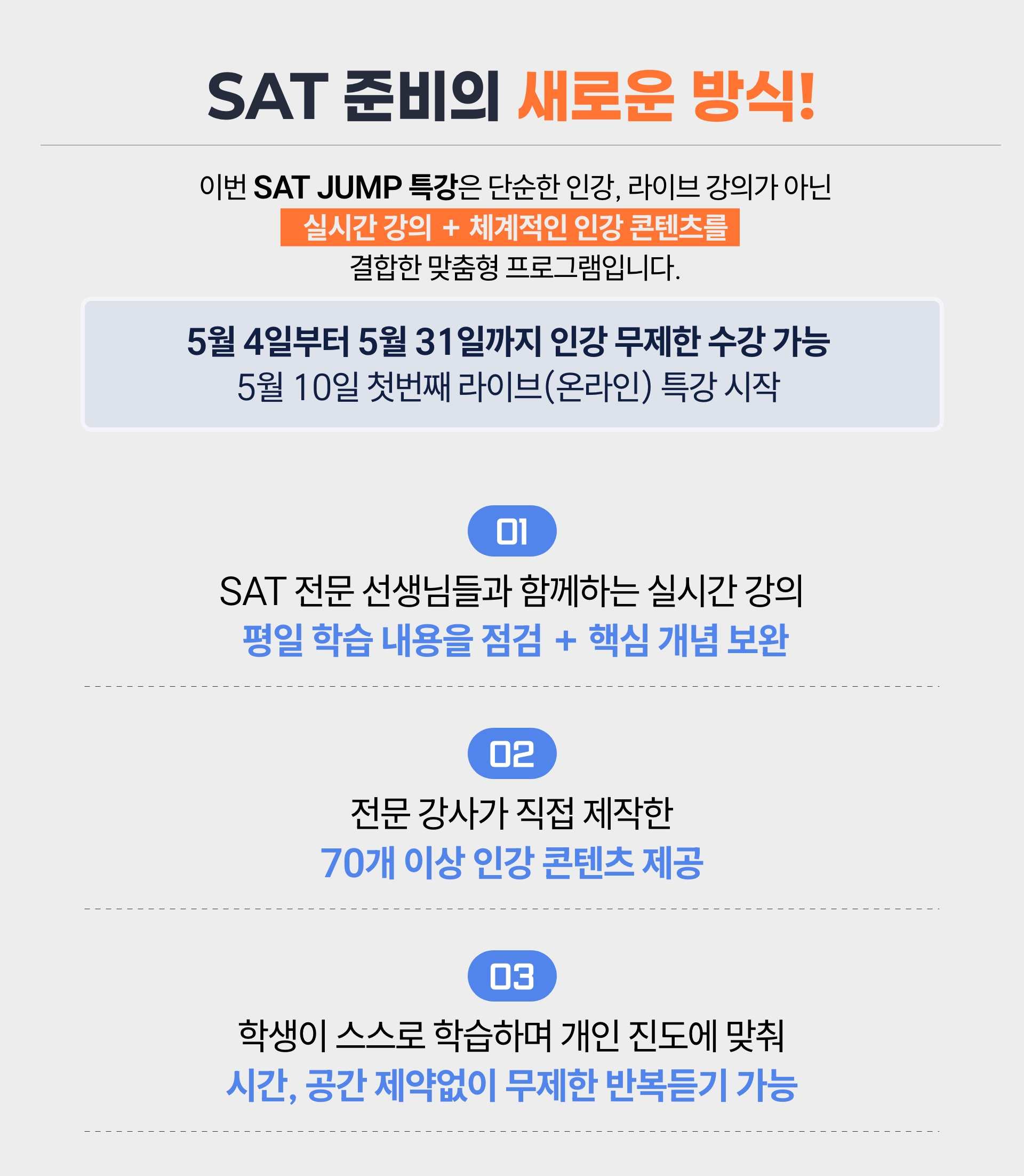 **SAT JUMP 특강은 라이브 강의와 인강 영상이 함께 제공되는 특별 과정으로, 수강 후에는 환불이 어려운 점 양해 부탁드립니다.**